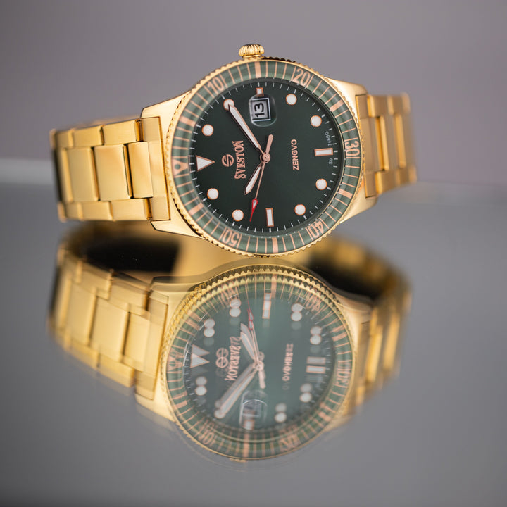 Sveston Zengvo is a analog battery powered 3 hand wrist watch, features a 39 mm round case on a Classic Stainless steel with Pushbutton Deployment Clasp. Functions include hours, minutes, small seconds and date window on the Right. This watch comes complete with luxury box and 1 year international warranty.