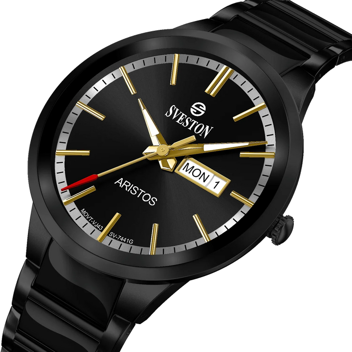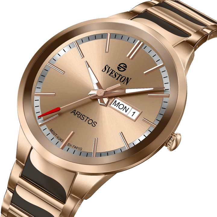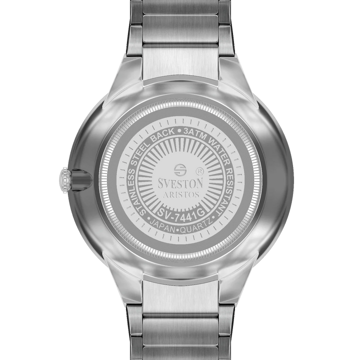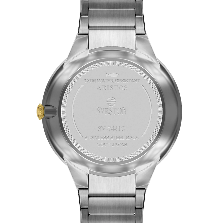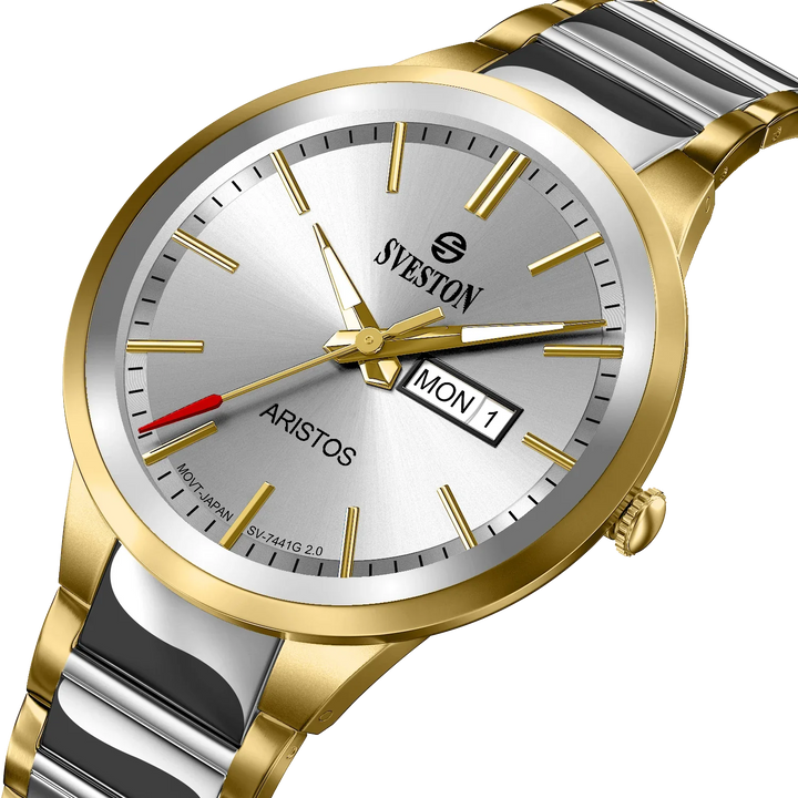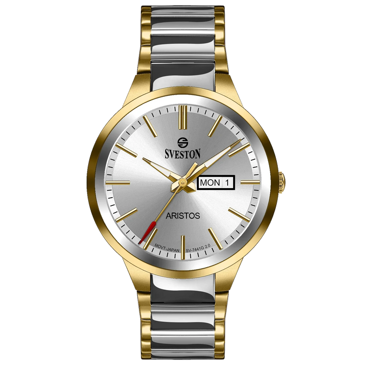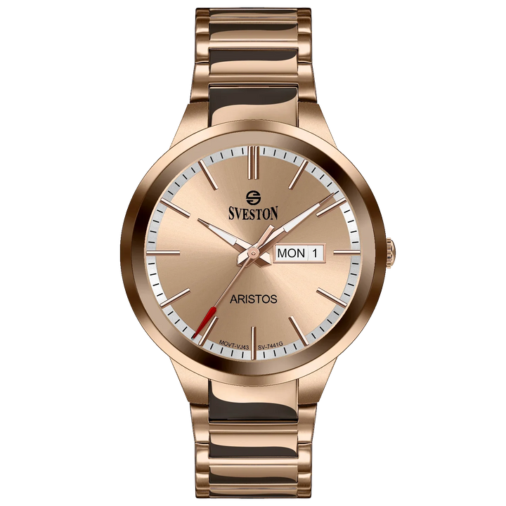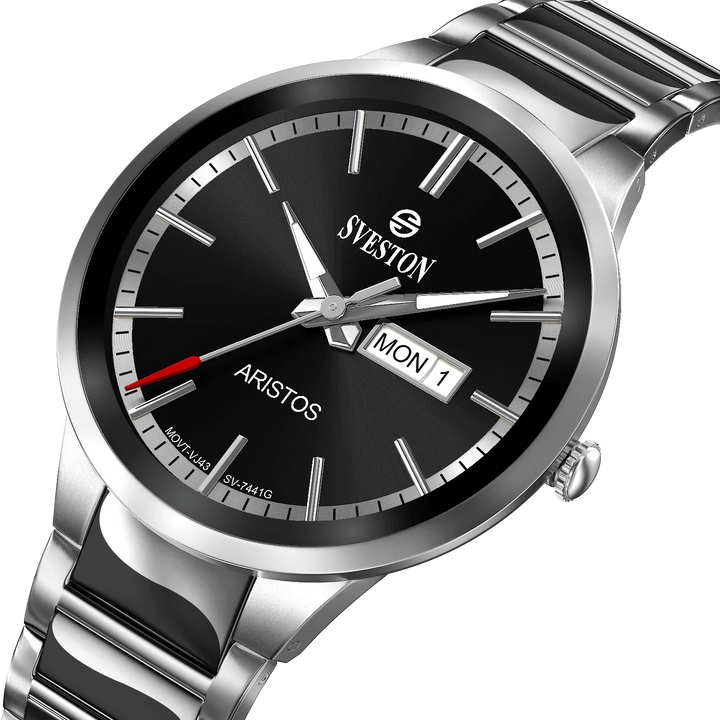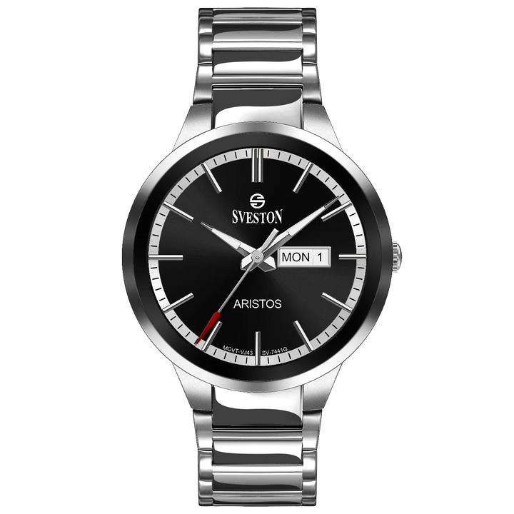 Sveston Aristos Avanti is a Female Battery-Powered 3-Hand Wrist Watch showcases a sophisticated design with a 28mm round case complemented by a Link Stainless Steel featuring a Pushbutton Deployment Clasp It offers essential functionalities including hours minutes small seconds and a date window positioned on the right side This elegant timepiece comes packaged in a luxury box and includes a 1-year international warranty for added assurance.