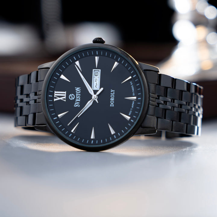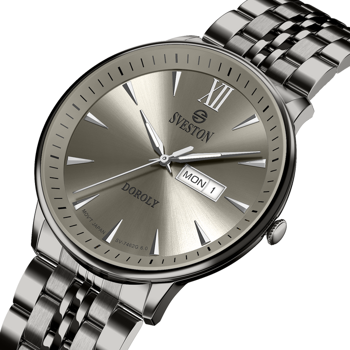 Doroly a sophisticated stainless steel watch for men featuring Japanese quartz movement with a 38mm case size and 44mm lug-to-lug distance it's a perfect fit for any wrist weighing in at 121 grams this timepiece is both durable and comfortable 3ATM water resistance ensures it can withstand splashes and light rain. get yours now and elevate your style game