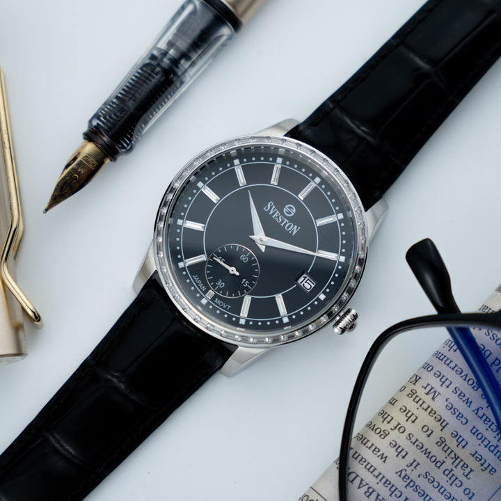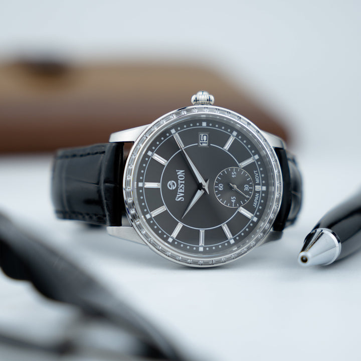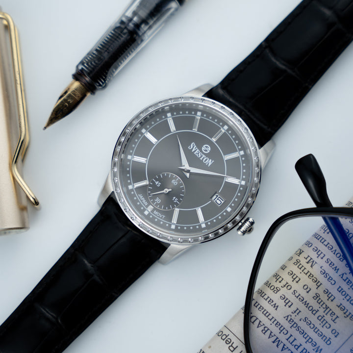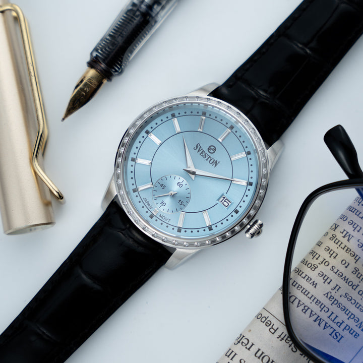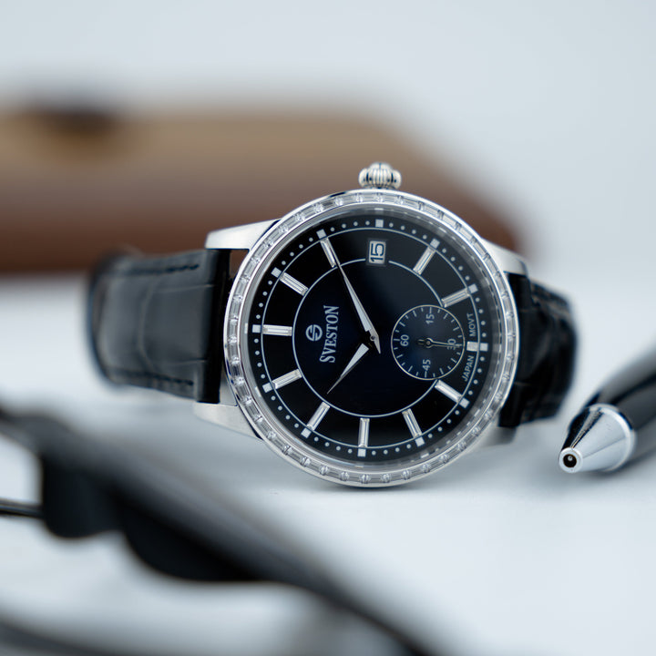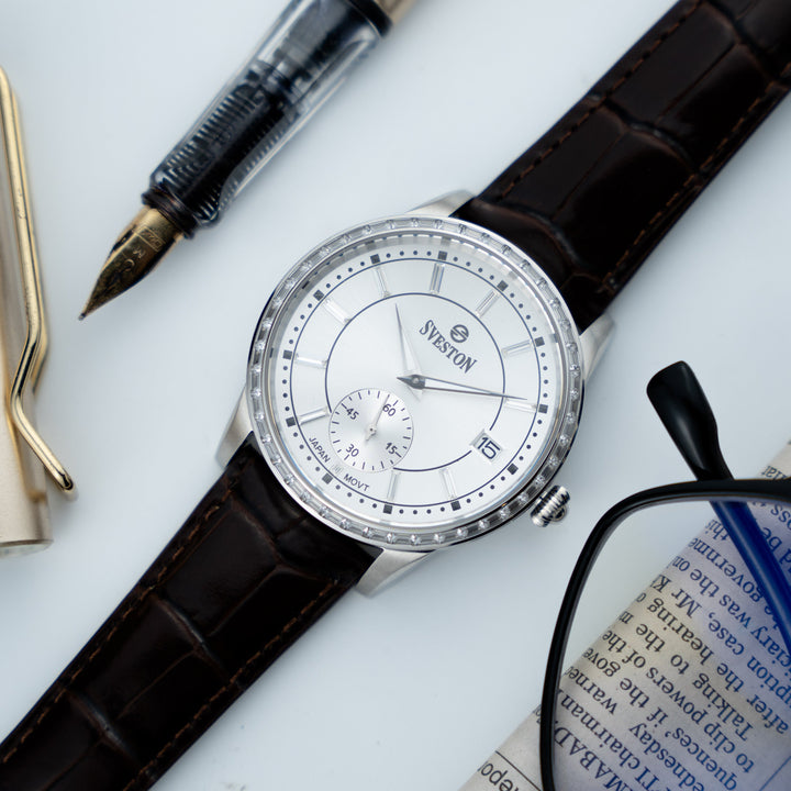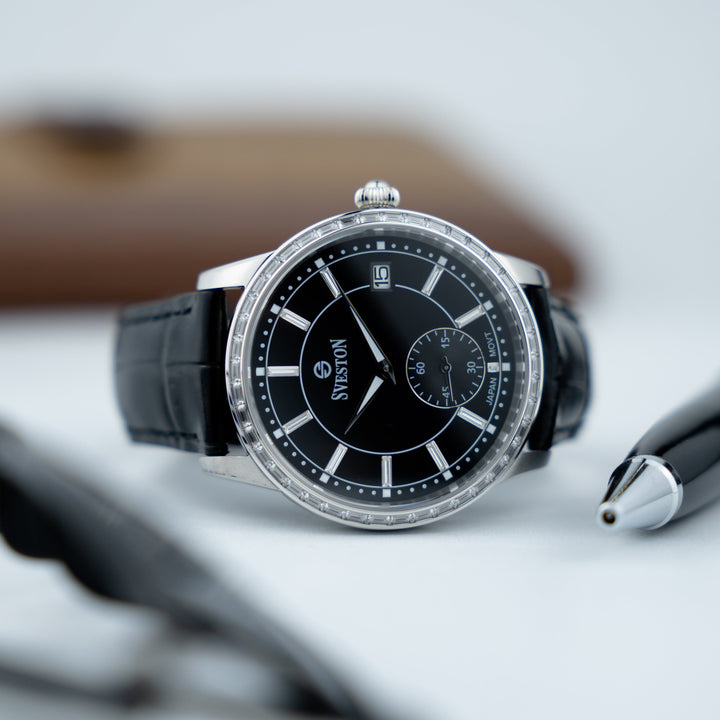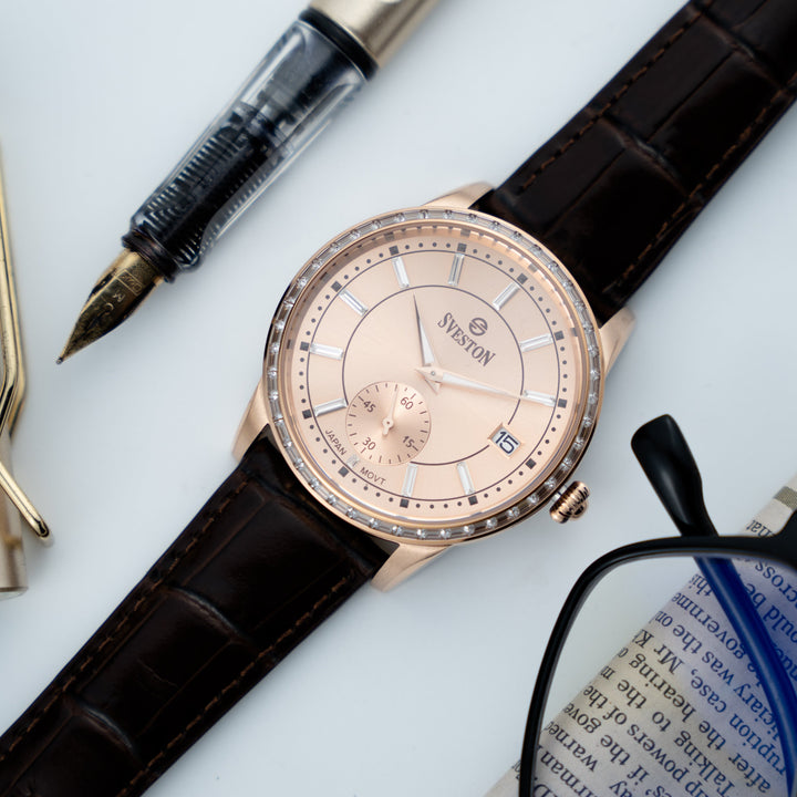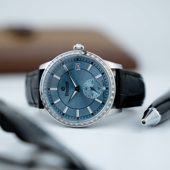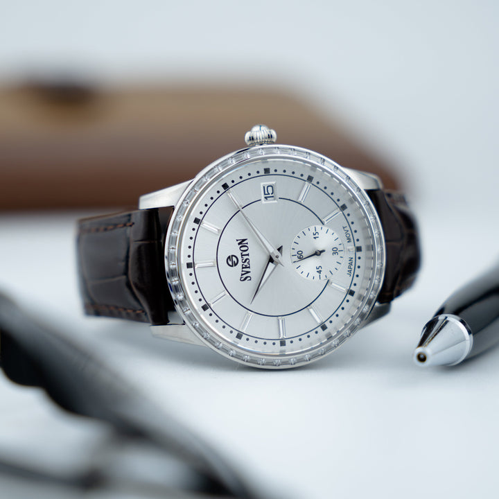 Sveston Venture a classic gents' leather watch featuring a 38mm dial elegantly crafted for a timeless look It comes with a luxury watch case making it a perfect choice for formal occasions