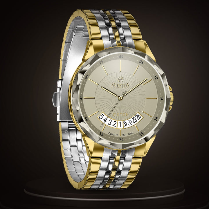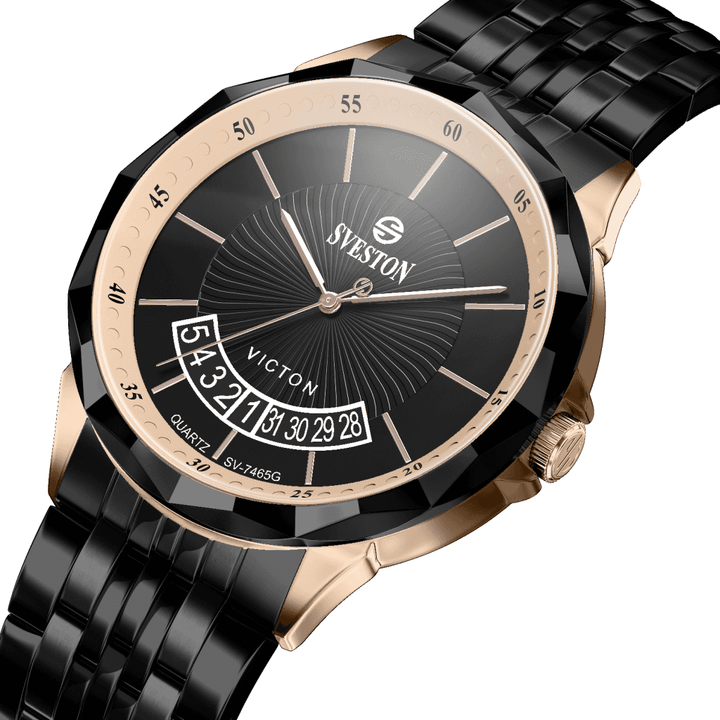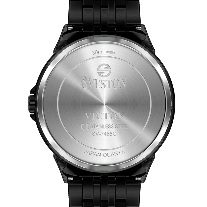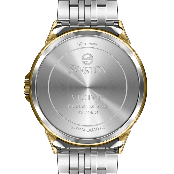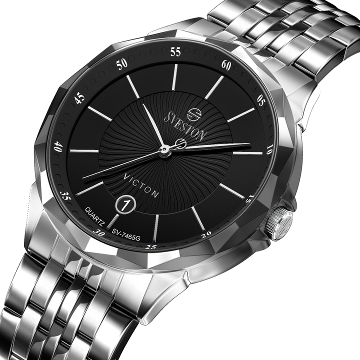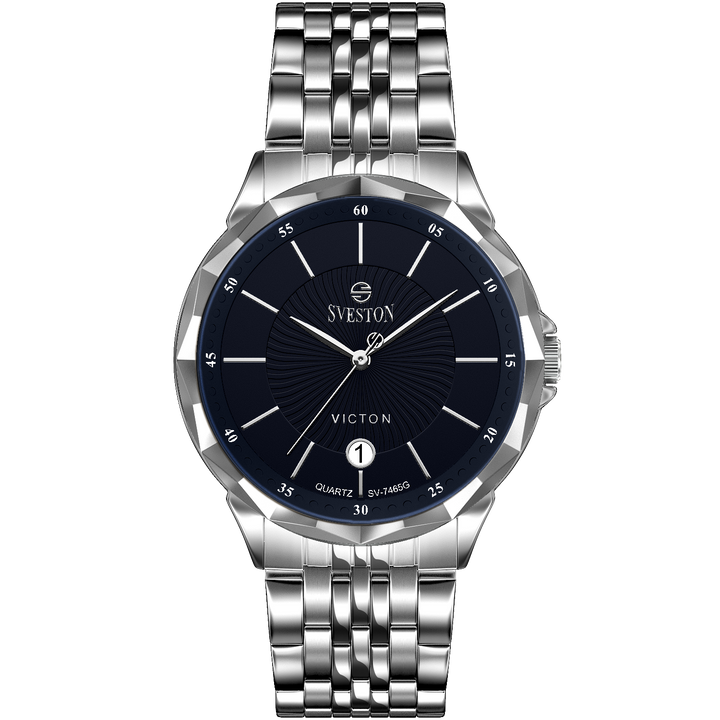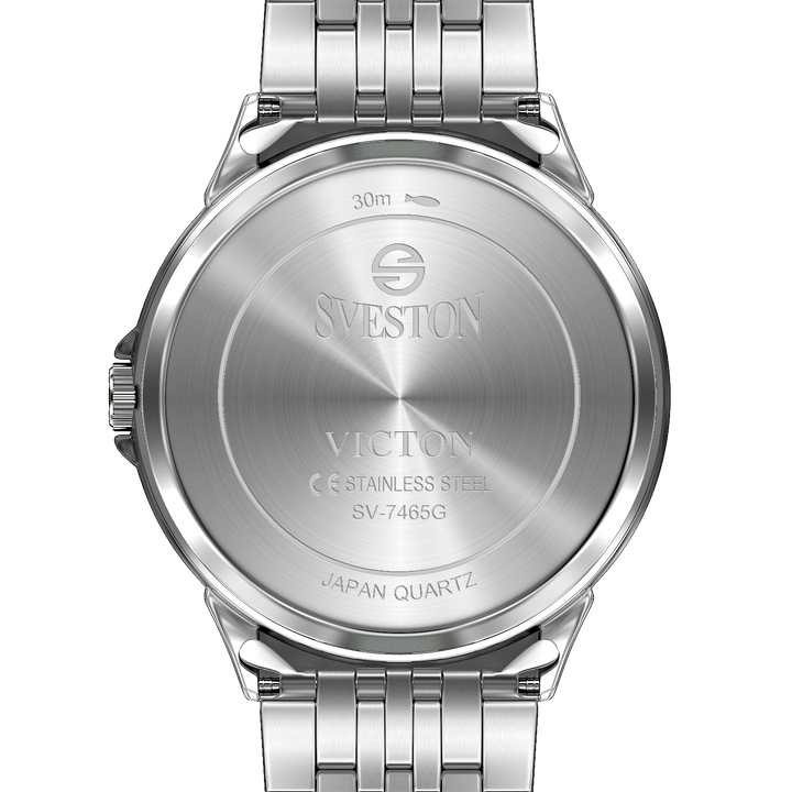 Sveston victon 2.0 battery powered 3 hand wrist watch features a 39mm round case on a Link Stainless Steel with Butterfly Deployment Clasp Functions include hours minutes small seconds & the date window on Bottom this watch comes complete with luxury box and 1 year international warranty