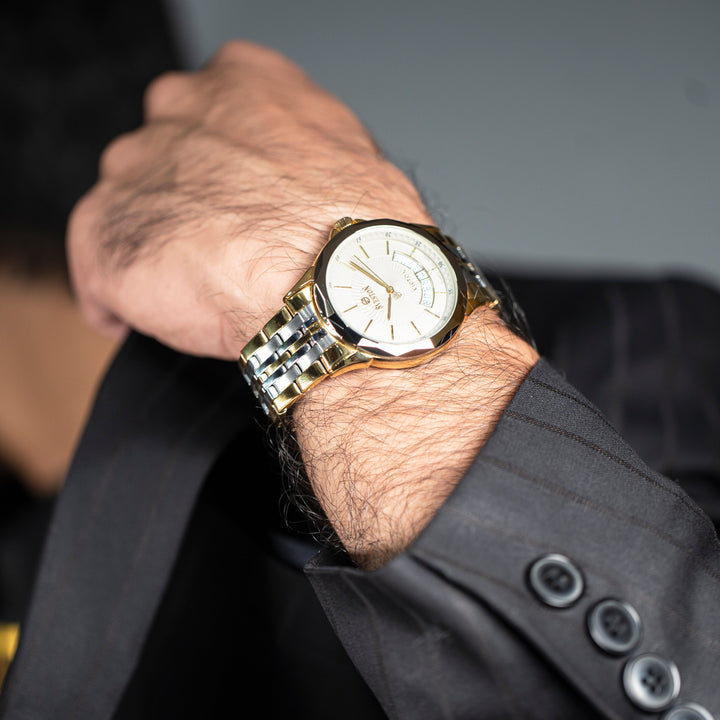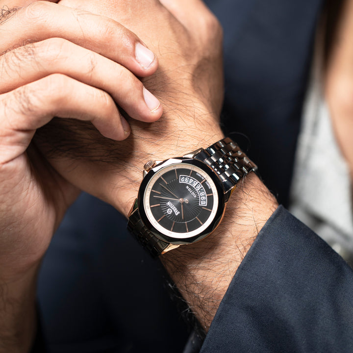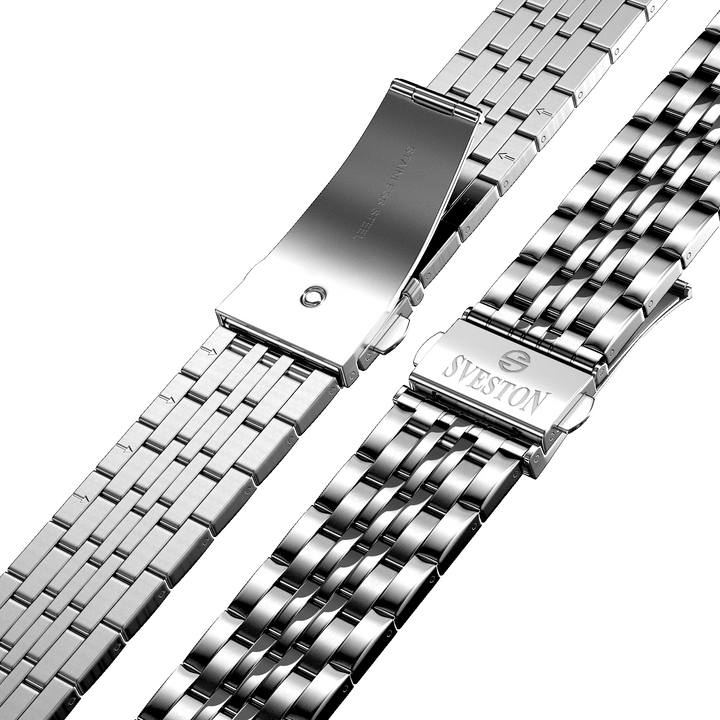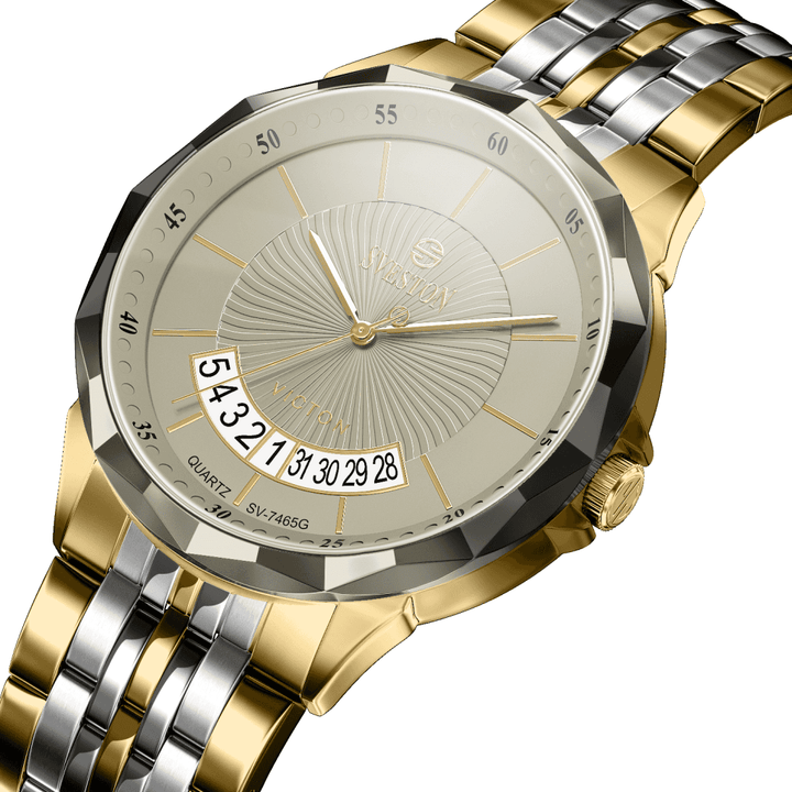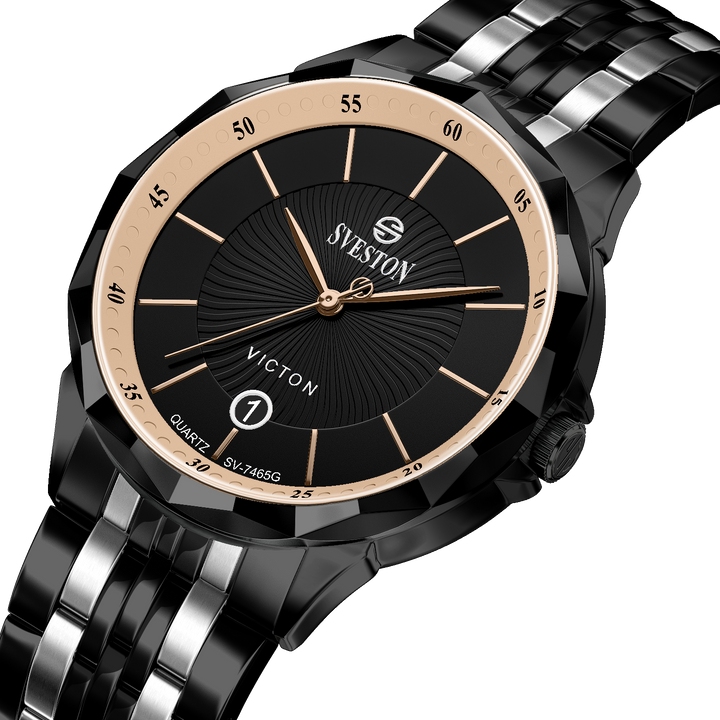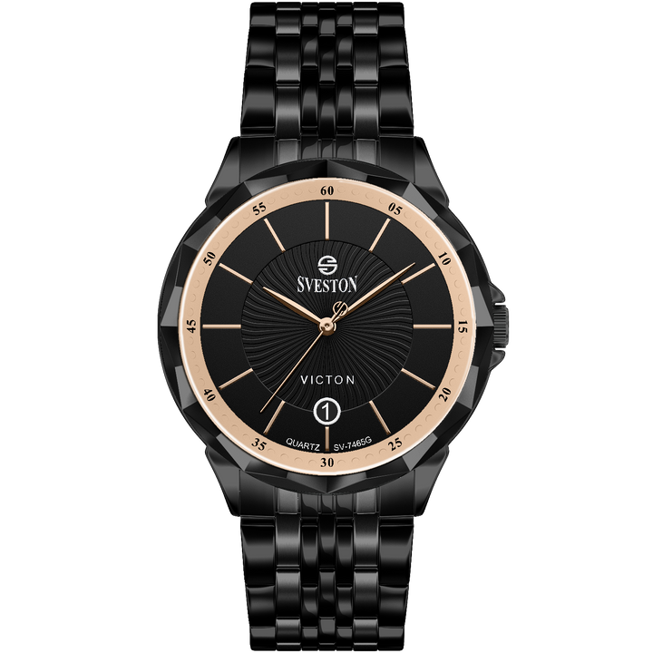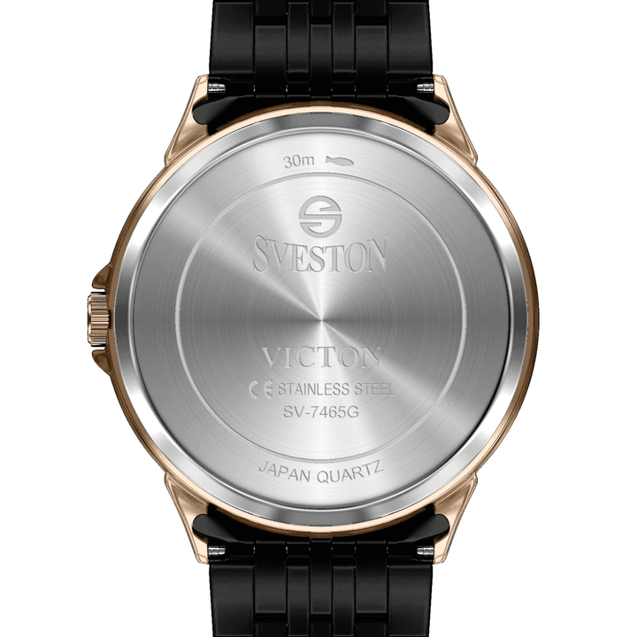 Sveston victon 2.0 battery powered 3 hand wrist watch features a 39mm round case on a Link Stainless Steel with Butterfly Deployment Clasp Functions include hours minutes small seconds & the date window on Bottom this watch comes complete with luxury box and 1 year international warranty
