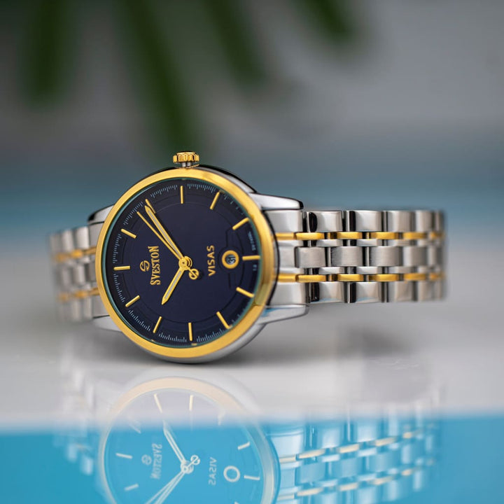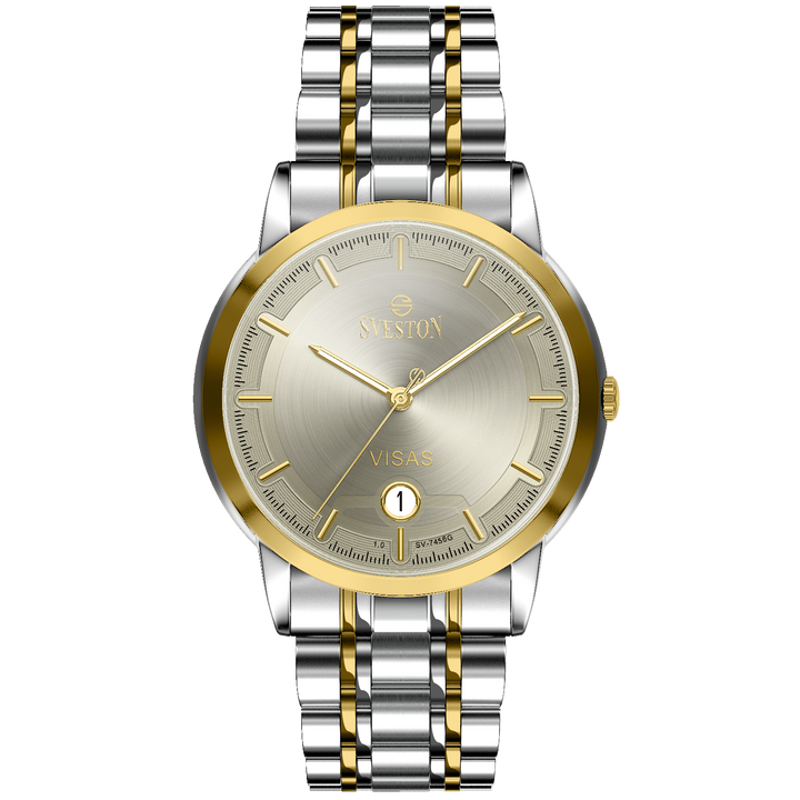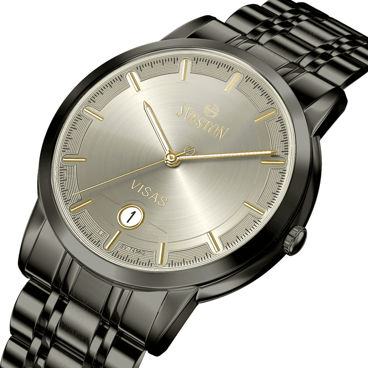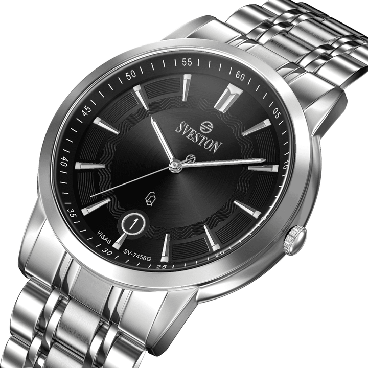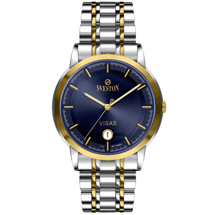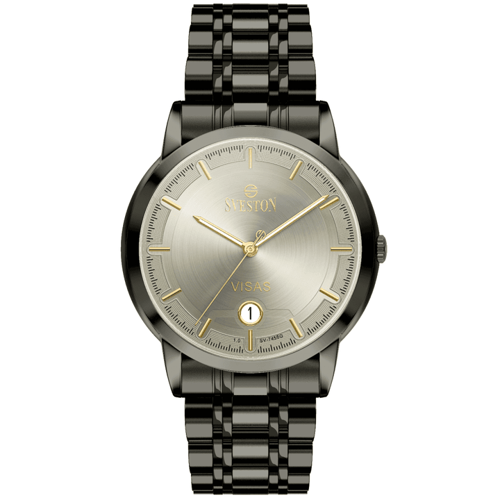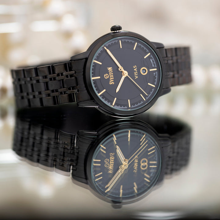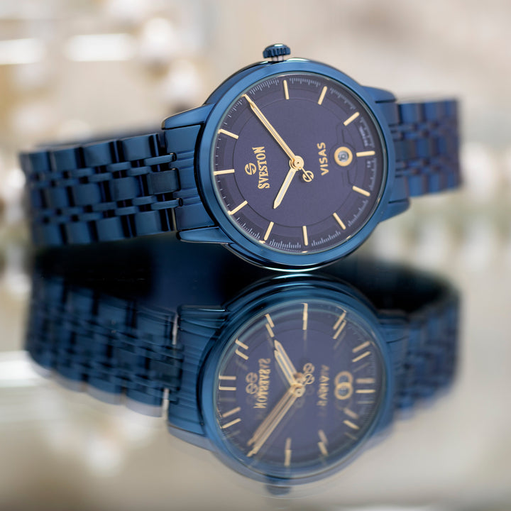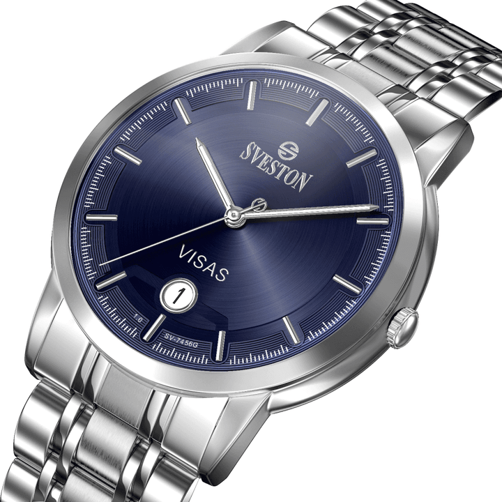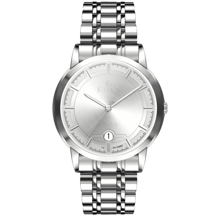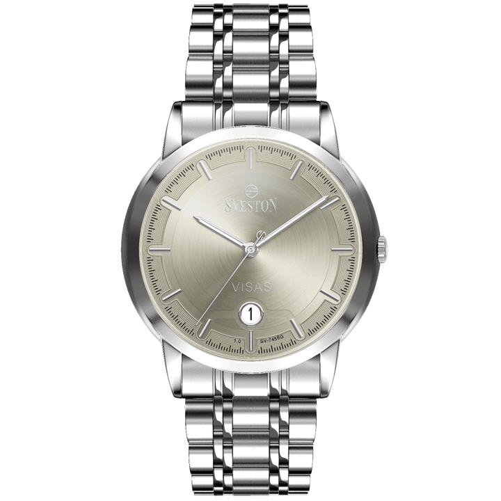 Sveston Visas is a analog battery powered 3 hand wrist watch features a 29mm Round case on a Link with Butterfly Deployment Clasp Functions include hours minutes small seconds and date window on the Bottom this watch comes complete with luxury box and 1 year international warranty