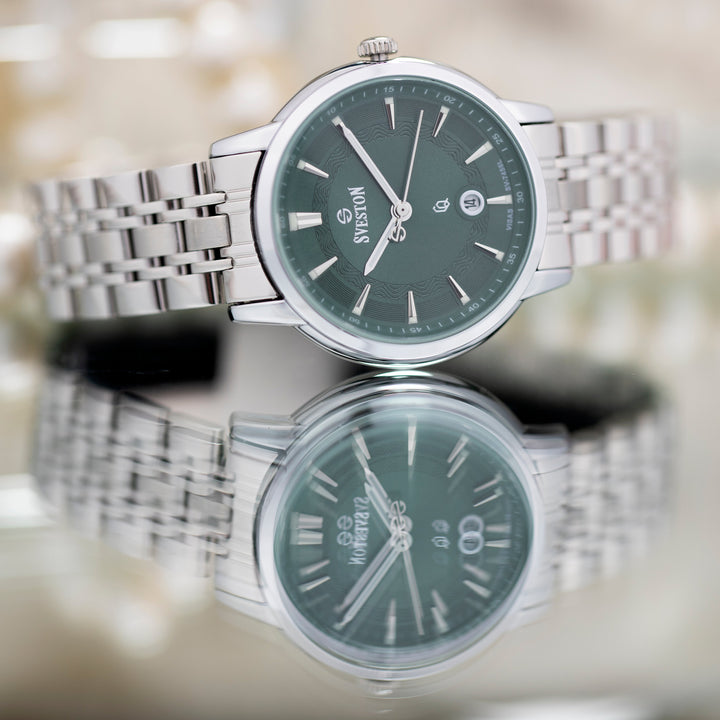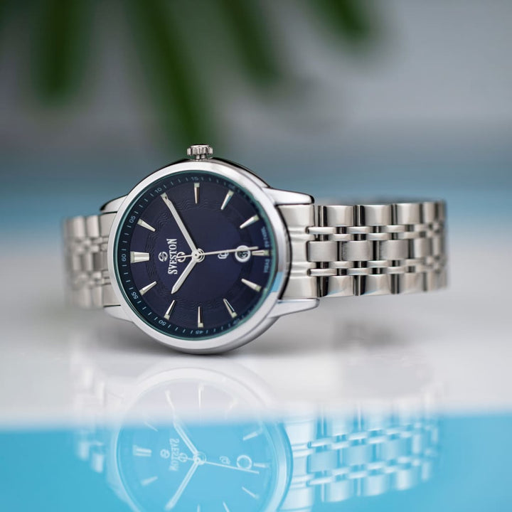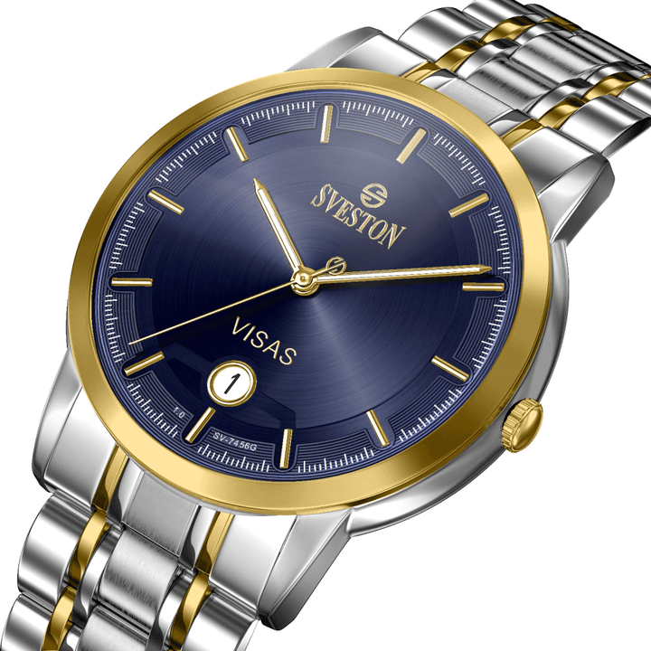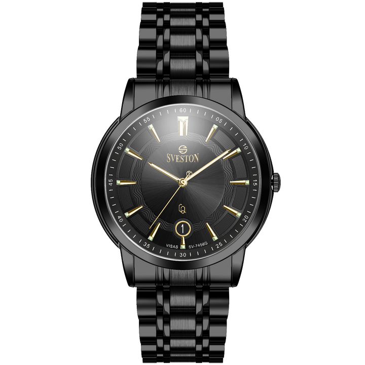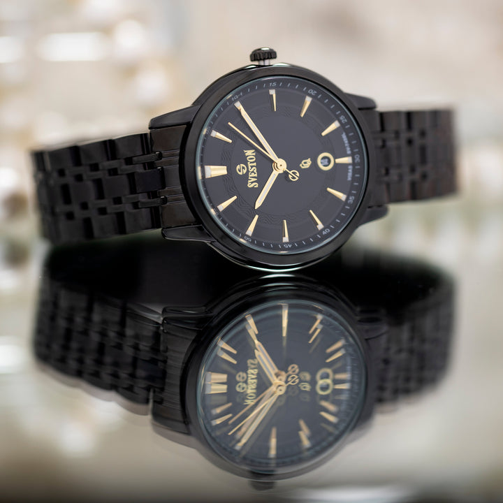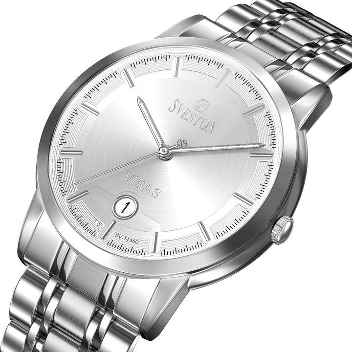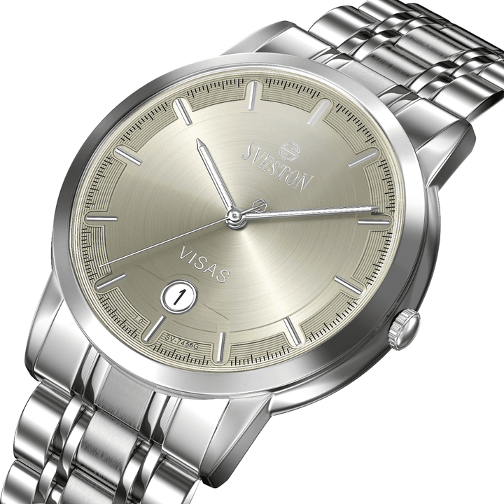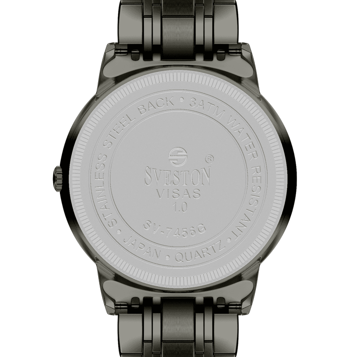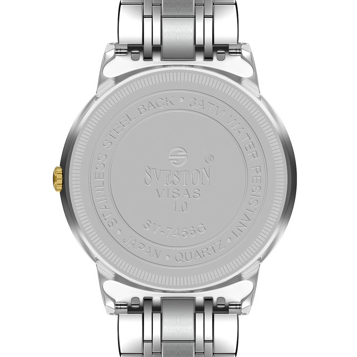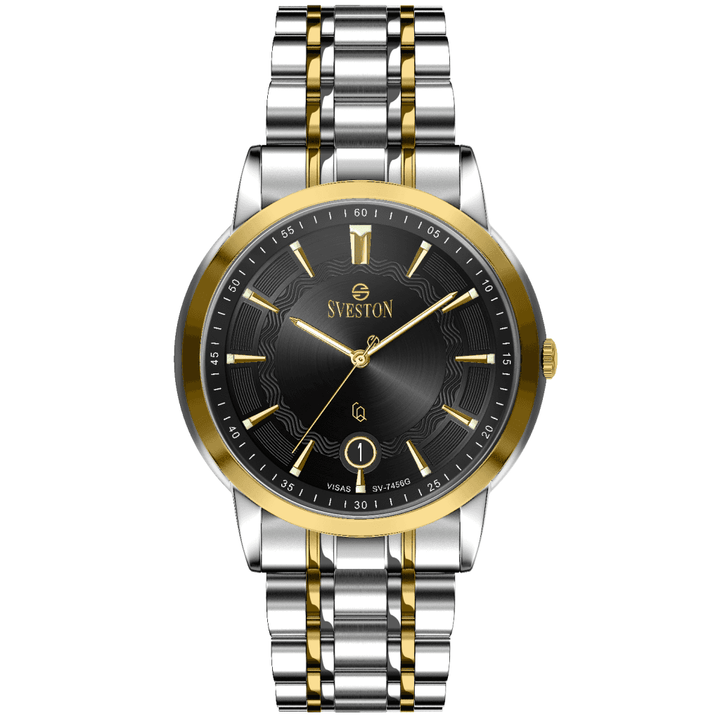 Sveston Visas is a analog battery powered 3 hand wrist watch features a 29mm Round case on a Link with Butterfly Deployment Clasp Functions include hours minutes small seconds and date window on the Bottom this watch comes complete with luxury box and 1 year international warranty