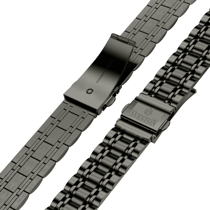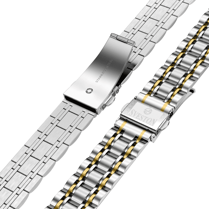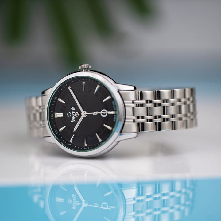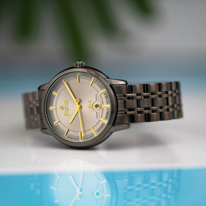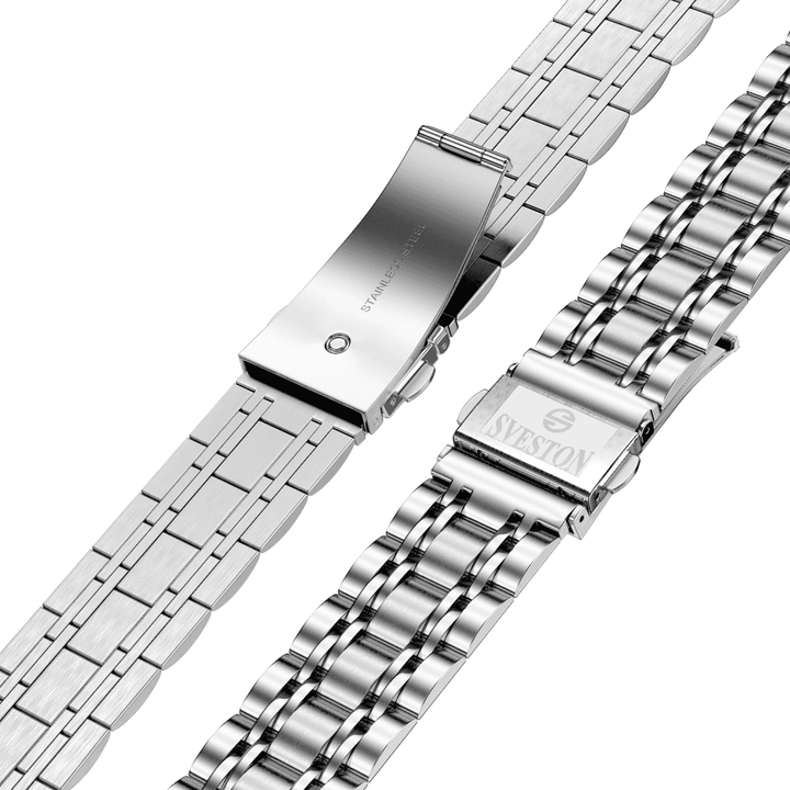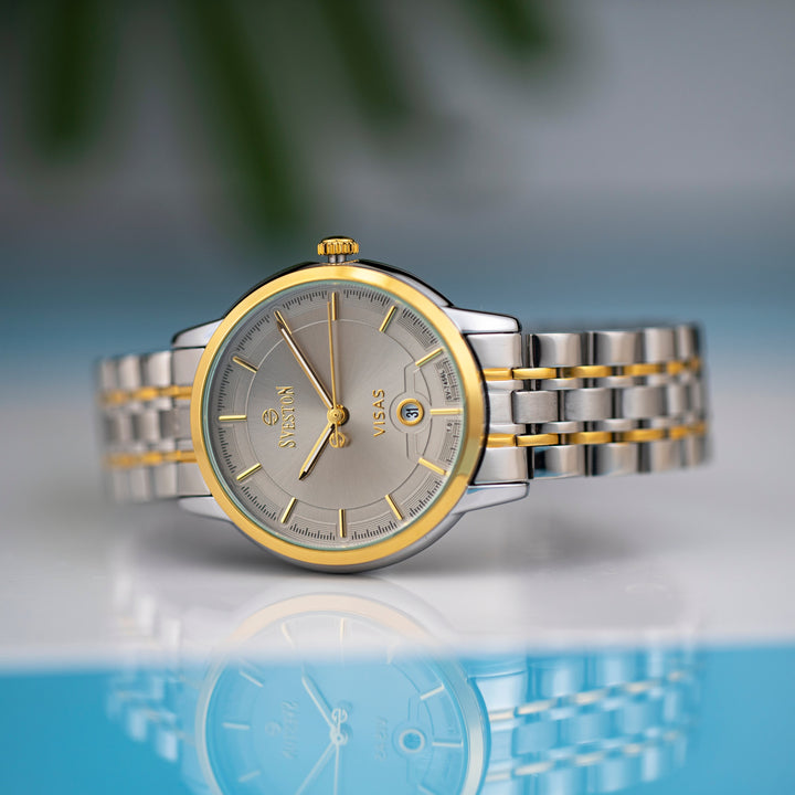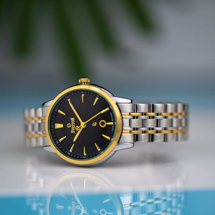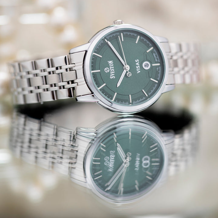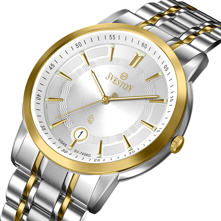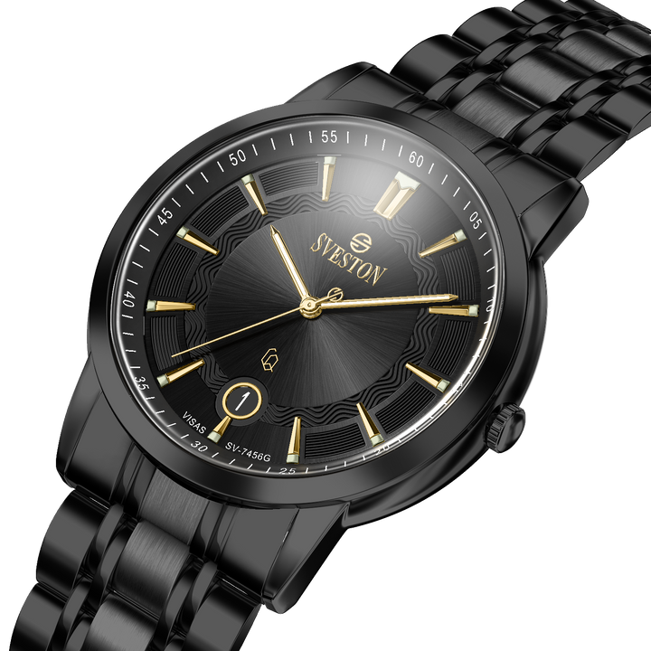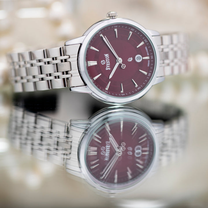Sveston Visas is a analog battery powered 3 hand wrist watch features a 29mm Round case on a Link with Butterfly Deployment Clasp Functions include hours minutes small seconds and date window on the Bottom this watch comes complete with luxury box and 1 year international warranty